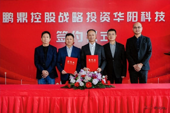 (左一:华阳科技副董事长徐荣灿先生;左二:华阳科技董事长&总经理朱荣惠先生;中间:鹏鼎控股总经理林益弘先生;右二:鹏鼎控股财务长萧得旺先生;右一:金鼎资本 创始合伙人何富昌先生)